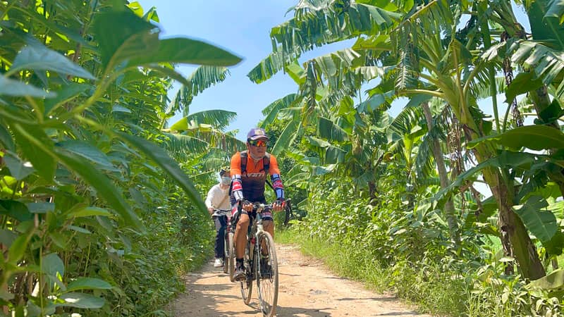 Ensuite, avec l'aide de notre guide, nous amorcerons la descente du pont vers la terre ferme, une expérience palpitante sur une pente escarpée. Pendant environ 2 heures, nous pédalerons paisiblement à travers la jungle de bananiers, les champs de légumes variés et les modestes habitations des agriculteurs vietnamiens longeant le légendaire fleuve Rouge.