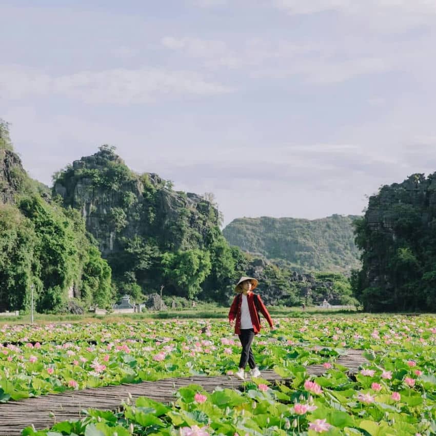 Au cœur du somptueux complexe paysager de Tràng An, cet étang de lotus adjoint une note de douceur au décor grandiose de Hang Múa. Le célèbre mont éponyme, aux allures escarpées, domine majestueusement cette vaste étendue d'eau où s'épanouissent les nénuphars. Un chemin de bambou serpente parmi les feuillages verdoyants, ajoutant une touche champêtre à l'ensemble. De fin mai à début juin, les lotus entrent en floraison, déployant leurs corolles délicates qui se parent d'abord de boutons, puis de fleurs d'un rose éclatant et d'un blanc immaculé.