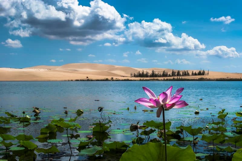 Niché près des dunes de sable blanc, ce lac d'eau douce offre un spectacle d'une rareté fascinante : des champs de lotus fleurissant à quelques pas des étendues désertiques. Une oasis de quiétude où s'épanouissent majestueusement les corolles roses au cœur d'un paysage unique. La floraison bat son plein d'avril à août sur le calendrier lunaire, période idéale pour embarquer pour une excursion à Mui Ne.
